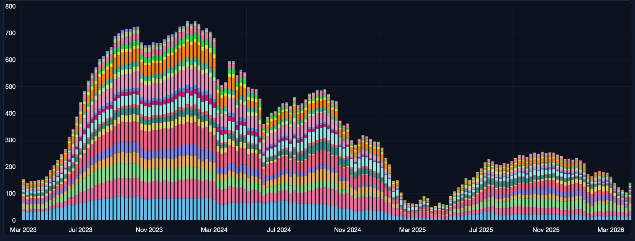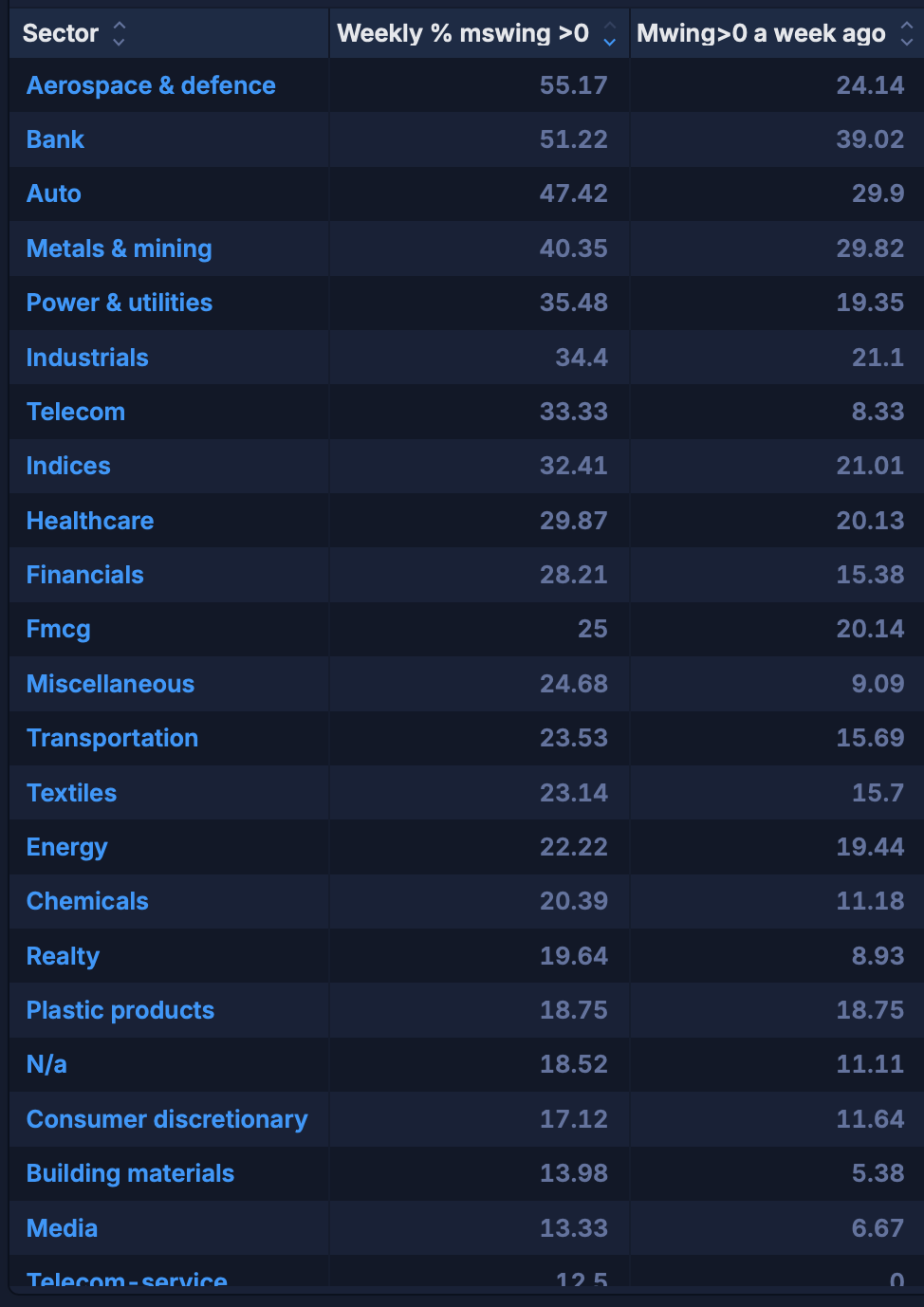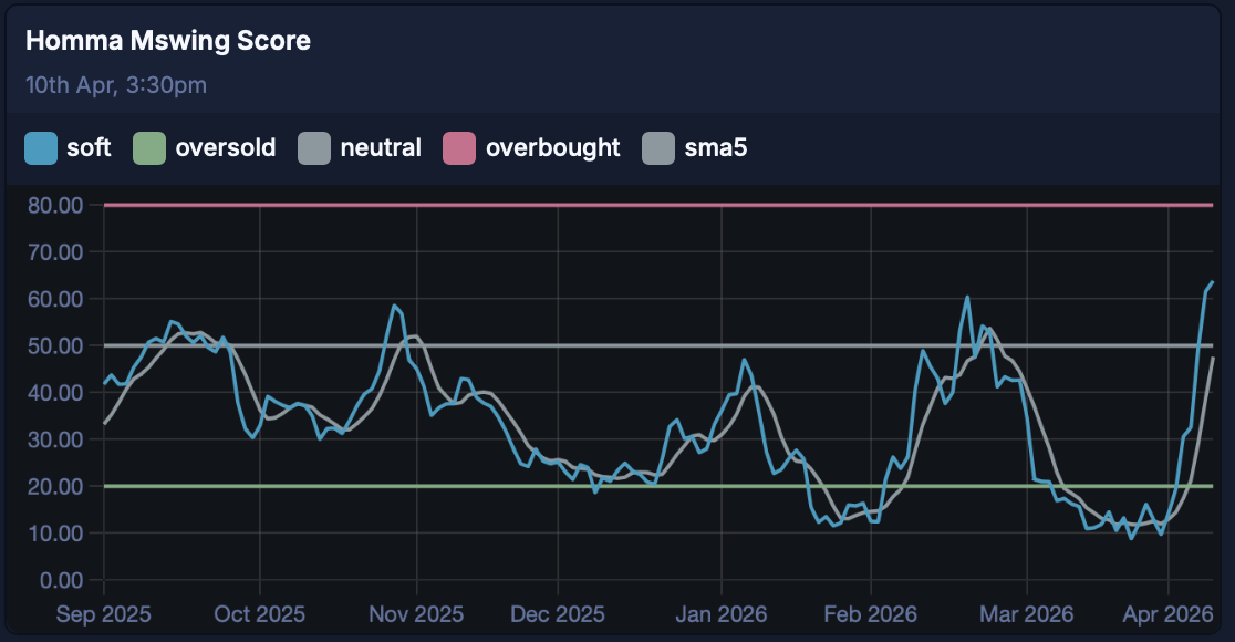 A weekly Mswing >50% and rising is bullish; <50% and falling is bearish.