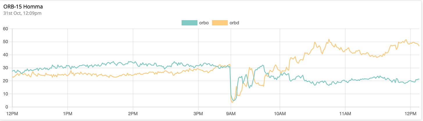 Homma ORB-15 plots the percentage of stocks that broke out the 15-minute range high (ORBO) and low (ORBD) and are sustaining.