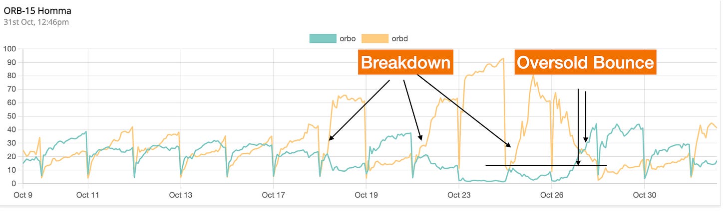 See below how the ORBO crossed ORBD and trended higher on the bounce day from the oversold condition on the 26th of October 2023. CNX500 chart for reference below.