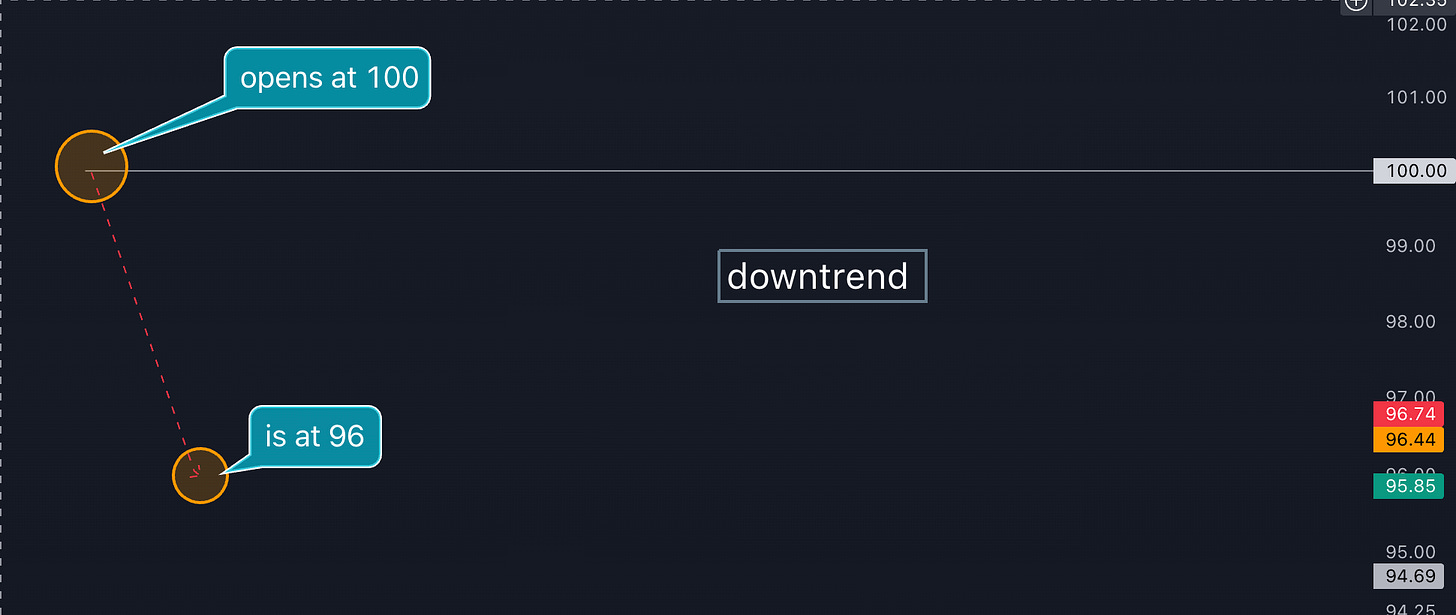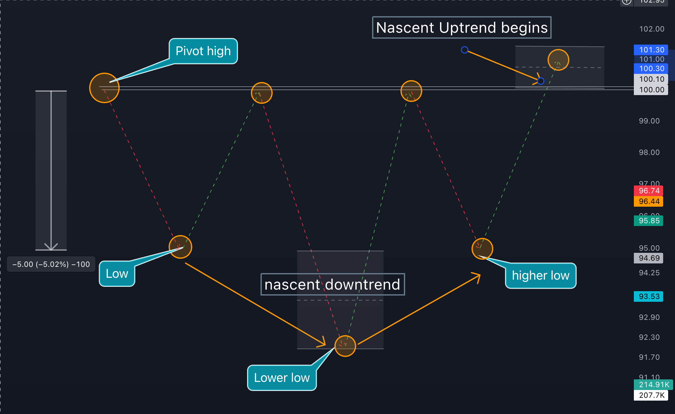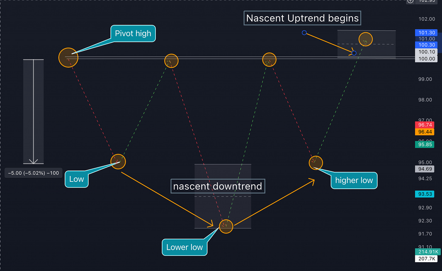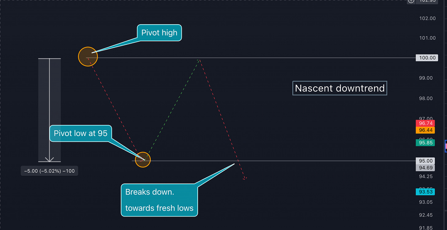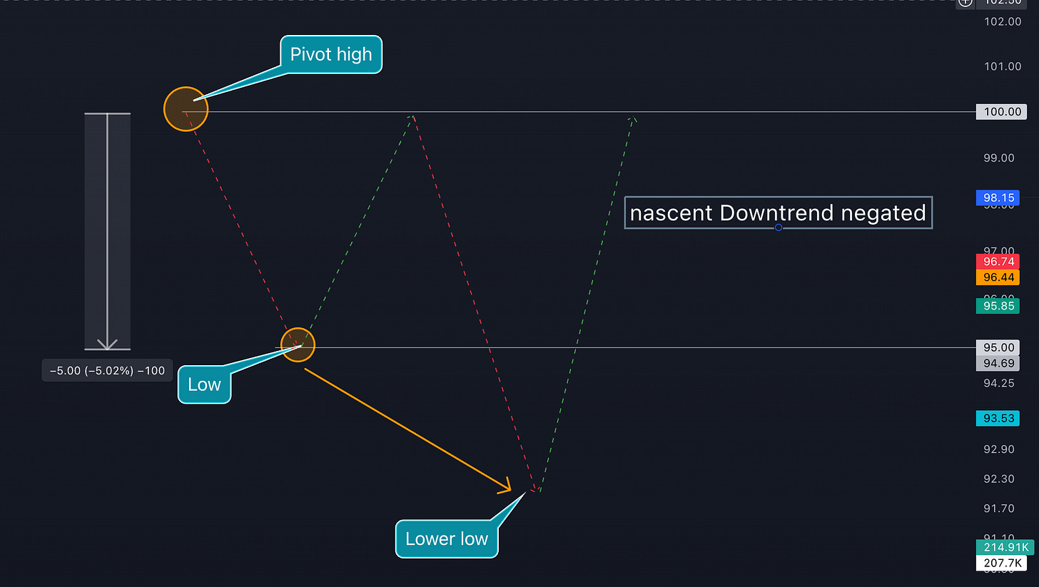 Since this is not a lower high. The nascent downtrend is negated. But only for the time being. Had it been a lower high than 100, it would have been a lower high and we would be still in a downtrend. If the price hits a lower pivot low (lower than 92), the downtrend continues.